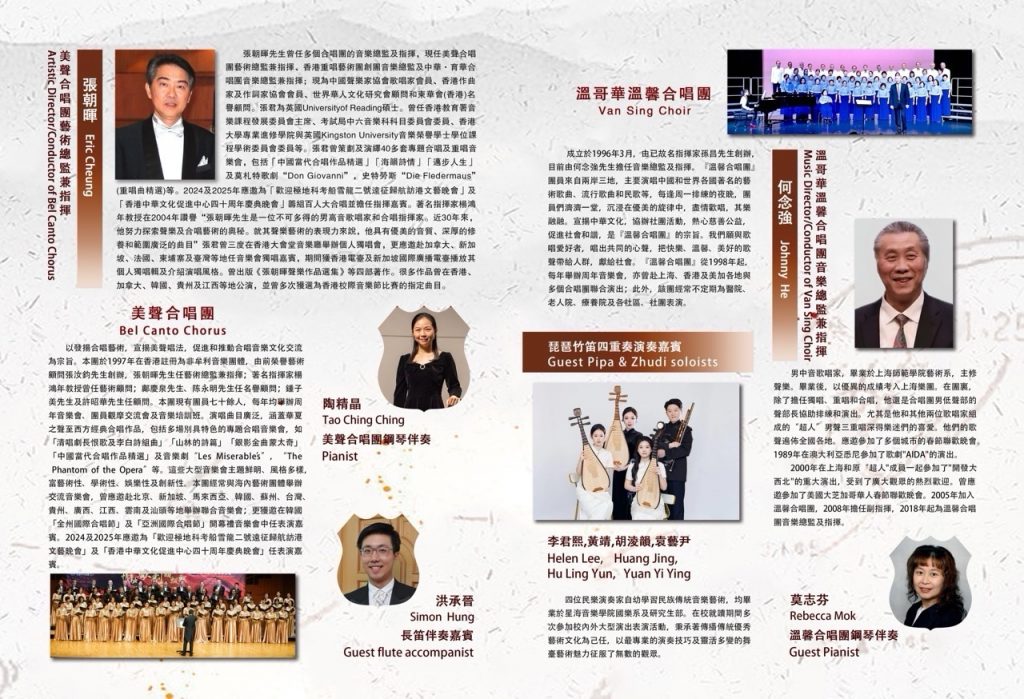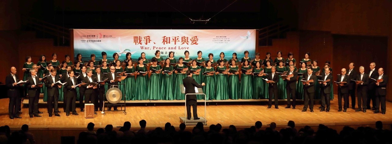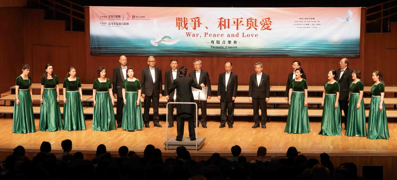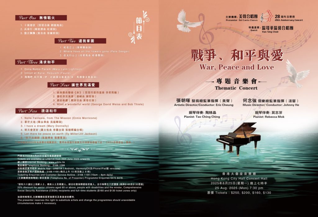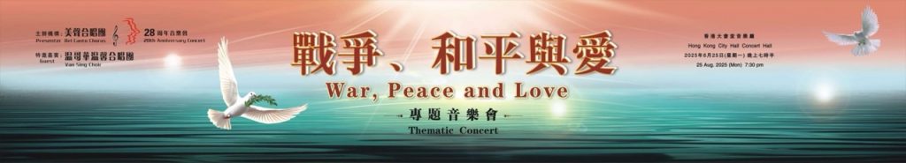 《戰爭、和平與愛》 港加合唱藝術交流音樂會 美聲合唱團28周年音樂會 美聲合唱團28周年音樂會 演出日期:2025年8月25日 演出地點:香港大會堂音樂廳 主辦單位:美聲合唱團 指揮:張朝暉(香港) 特邀嘉賓:溫哥華溫馨合唱團 指揮:何念強(溫哥華) 演出片段 音樂會序言 2025 照片集 演出片段 1) 和平的翅膀 (張朝暉曲 張雁霄詞) (世界首演) 美聲合唱團 指揮: 張朝暉 2) 兵車行 (陳能濟曲 杜甫詞) 美聲合唱團 指揮: 張朝暉 3) 旗正飄飄 (混聲合唱) (黃自曲 韋瀚章詞)美聲合唱團 指揮: 張朝暉 4)Dona Nobis Pacem (混聲小合唱) (Mary Lynn Lightfoot)美聲合唱團指揮: 張朝暉 5) Introit & Kyrie, Requiem (混聲合唱) (Gabriel Faure)(進堂詠和垂憐經,)美聲合唱團 指揮: 張朝暉 6) 飛翔吧,和平鴿 (混聲合唱) (伊·杜納耶夫斯基曲 米·馬都索夫斯基詞)美聲合唱團指揮: 張朝暉 7) 在太行山上 (混聲合唱) (冼星海曲 桂濤聲詞)美聲合唱團,溫馨合唱團 指揮: 何念強 8)蒼茫大地 (混聲合唱) (陳永華曲 吳瑞卿詞)美聲合唱團指揮: 張朝暉 9) Nella Fantasia我的夢想 from The Mission(film) (混聲合唱) (Ennio Morricone)美聲合唱團指揮: 張朝暉 10) I Have a Dream我有一個夢 (Mary Donnelly) (女聲小組唱) 美聲合唱團 鋼琴伴奏:陶精晶 11) Let There be Peace on Earth (Sy Miller and Jill Jackson Miller) 美聲合唱團(香港),溫馨合唱團(加拿大) 指揮: 何念強 12)明天會更好 (混聲合唱) (羅大佑曲 李壽全詞 張朝暉編合唱)美聲合唱團 指揮: 張朝暉 音樂會序言 2025 p1_前言_戰爭、和平與愛的永恆追問 照片集